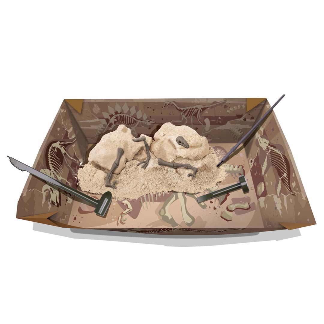 Inhalt: 1 Gipsblock mit eingebettetem Dinosaurierskelett, 1 Papier-Grabungsschale, 1 Klebestreifen zur Positionierung der Gelenke, 1 Hammer, 1 Meißel, 1 Pinsel und detaillierte Anleitung.
