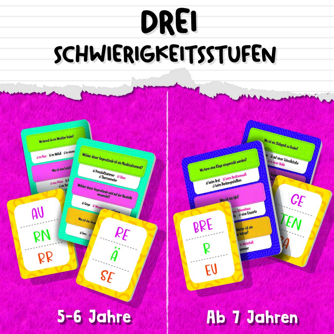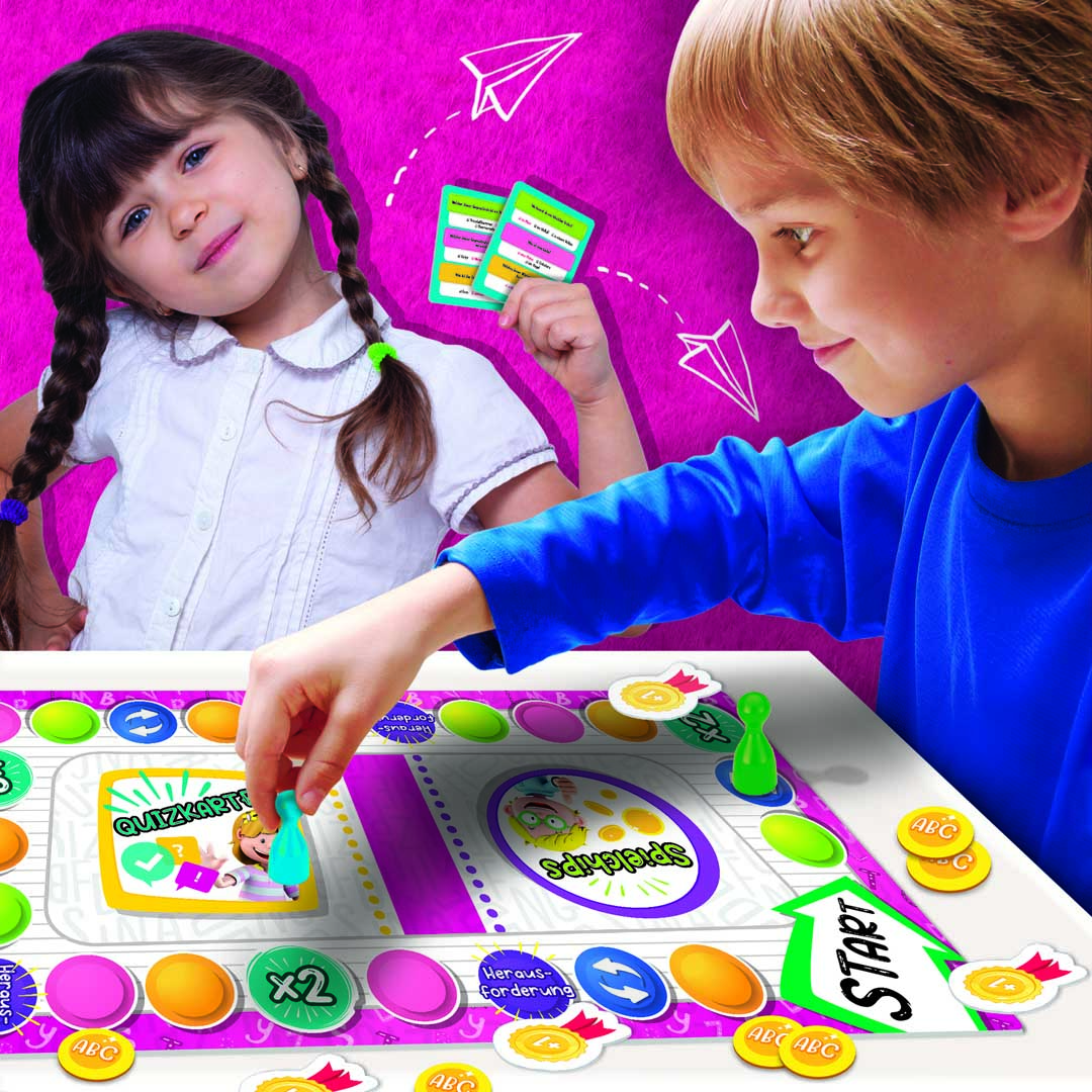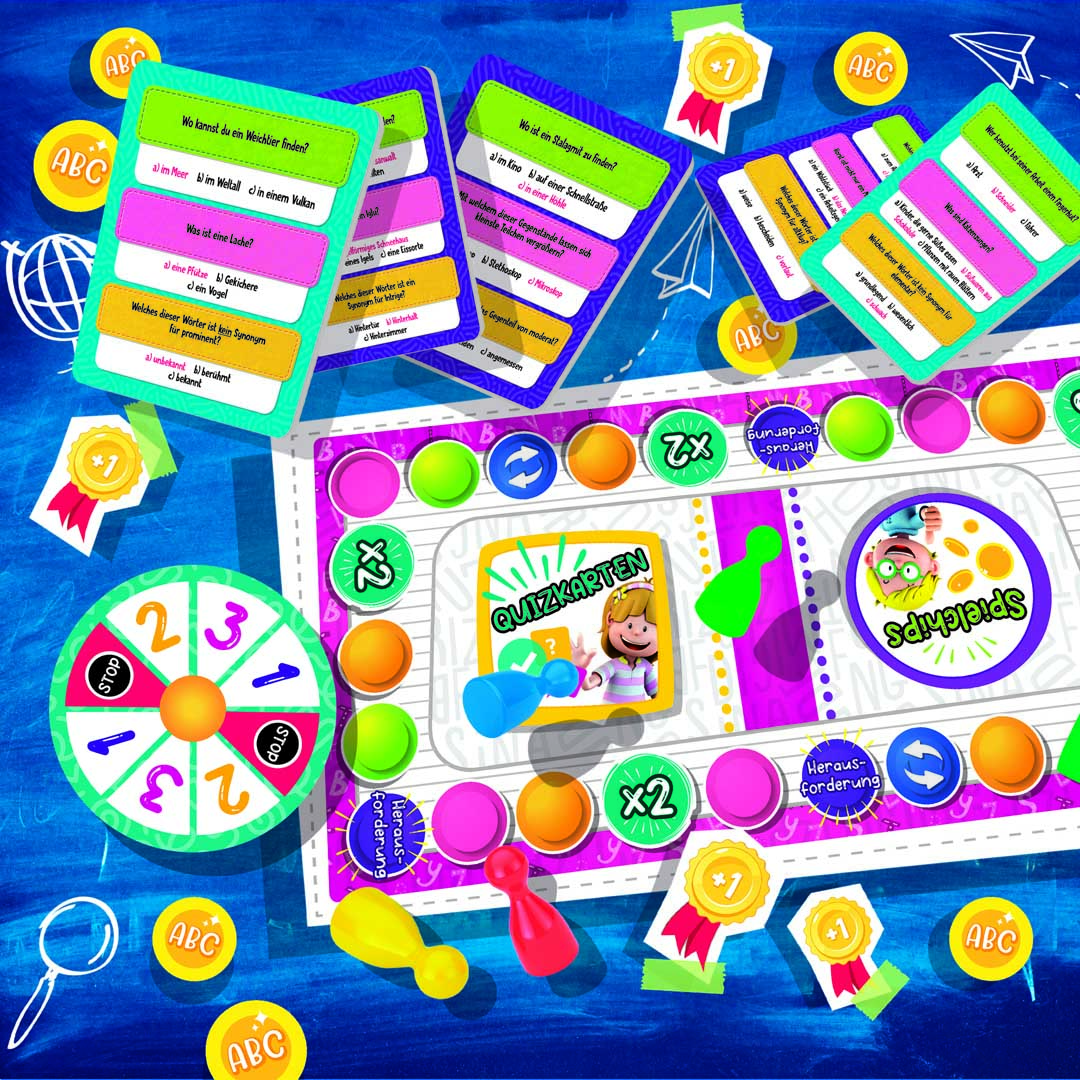 Das Wortschatz-Quiz beruht auf dem Lehrplan der Grundschule und trägt dazu bei, den grundlegenden Wortschatz und die Sprachkenntnisse der Kinder auf spielerische Weise zu festigen und zu unterstützen. Eine echte Lernhilfe. Durch das erfolgreiche Lösen der Minispiele dürfen die Spielfiguren auf dem Spielplan vorwärts gezogen werden. Dank der drei Schwierigkeitsstufen können auch KInder unterschiedlicher Schulstufen problemlos miteinander spielen und beim Bilden vieler verschiedener Wörter Spaß haben. Eine Spielidee des Forschungszentrums Lisciani.