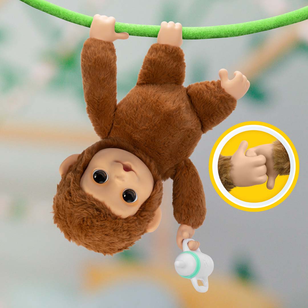 • Ausdrucksstarke Mundbewegung – er plappert, lutscht am Daumen oder an seiner Flasche – genau wie ein echtes Babyäffchen