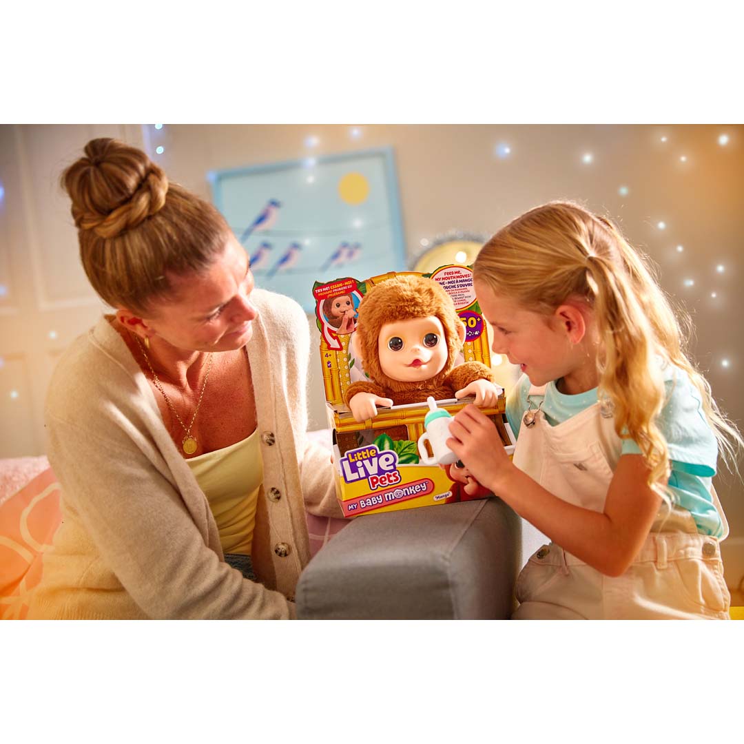 Little Live Pets präsentiert: Mango, das süße Babyäffchen! Mit seinem realistischen Aussehen und der naturgetreuen Haptik sieht es nicht nur aus wie ein echtes Äffchen – es verhält sich auch so: Seine Hände und Füße können greifen, halten und sich an Dingen festklammern – für echte Kuschelmomente! Der bewegliche Mund macht das Spiel noch lebendiger: Es ruft, plappert und lässt sich füttern. Mit über 50 Geräuschen und Reaktionen wird es schnell zu deinem besten kleinen Freund. So lebensecht, dass du zweimal hinschauen musst!