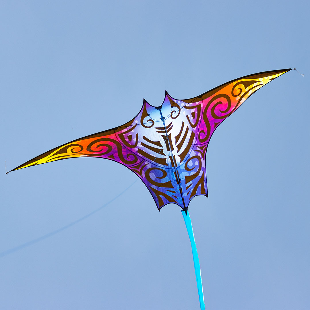 Der Manta Kite ist ein ganzflächig bedruckter Leichtwinddrachen nach einer Idee von Ralf Dietrich. Das Tribal Design von Rainer Kuhlmann gibt diesem beeindruckenden Leichtwindflieger einen coolen und modernen Look, der durch einen langen Drachenschwanz zusätzlich aufgewertet wird. Das 5 mm Kohlefasergestänge ist gut geeignet für schwachen oder mäßigen Wind bis maximal 4 Bft.
