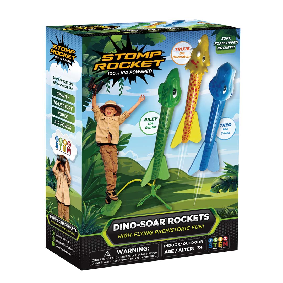 Mit der Dino-Soar Stomp Rocket startet eine Raketen-Show für kleine Entdecker! Einfach auf das Startkissen treten und die dino-inspirierten Raketen „Riley der Raptor“, „Trixie der Triceratops“ und „Theo der T-Rex“ heben ab. Die einstellbare Abschussrampe erlaubt Experimente mit Startwinkel, Kraft und Flugbahn. Natürlicher Antrieb mit Druckluft – keine Brennstoffe und keine Batterien erforderlich. Für Action im Freien: Perfekt für Garten, Park oder sonstige freie Flächen – fördert Bewegung, reduziert Bildschirmzeiten.