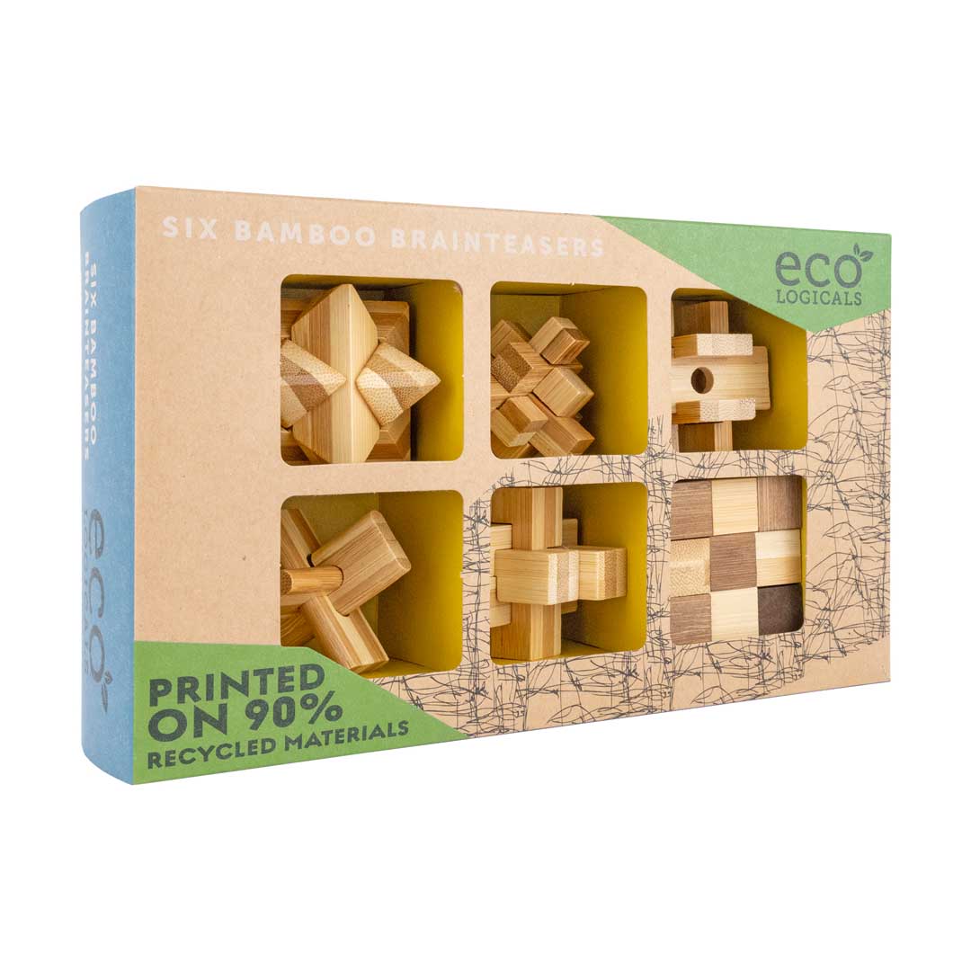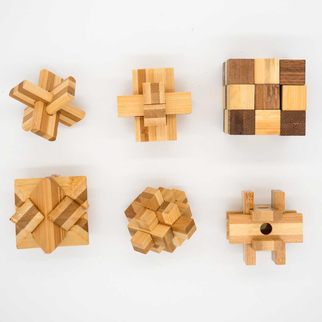 Ein sorgfältig zusammengestelltes Geschenkset mit sechs umweltfreundlichen Denkspielen aus Bambus, die jeweils eine einzigartige Zerlege-Herausforderung für Puzzlefans jeden Alters bieten. Verschiedene Schwierigkeitsgrade.