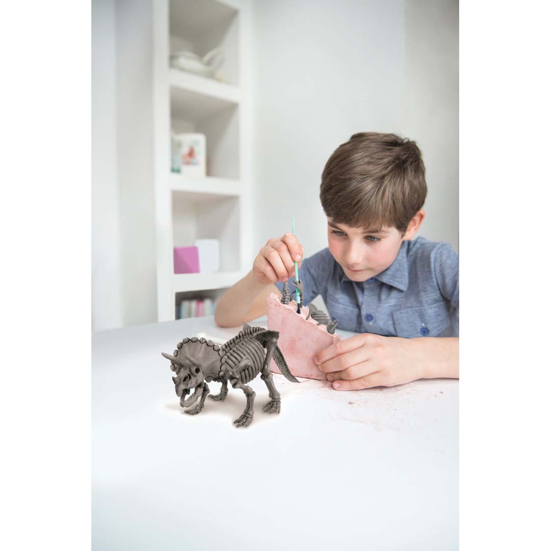 Entdecke die Geheimnisse der Urzeit! Werde zum Paläontologen und grabe ein verborgenes Triceratops-Skelett aus einem Gipsblock aus. Mit den Werkzeugen legst du die Knochen Schicht für Schicht frei – wie ein echter Forscher. Danach setzt du die Teile zu einem beeindruckenden, ca. 20 cm hohen Modell zusammen. Ein Displayständer ist enthalten, damit du deinen Dino stolz präsentieren kannst. Ein spannendes Erlebnis für kleine Dino-Fans!