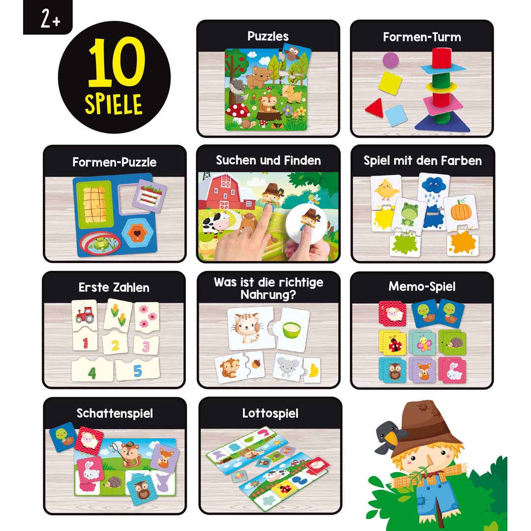Diese Sammlung von 10 verschiedenen Lernspielen steht im Einklang mit der Montessori-Pädagogik, weil sie altersgerechte Fähigkeiten entwickelt und fördert: Türme bauen, Puzzleteile zusammenstecken, Zahlen kennenlernen, Memory oder Lotto spielen. Auf lustige Art wird spielerisch Einblick in Formen, Farben, Logik und mehr gewährt.
