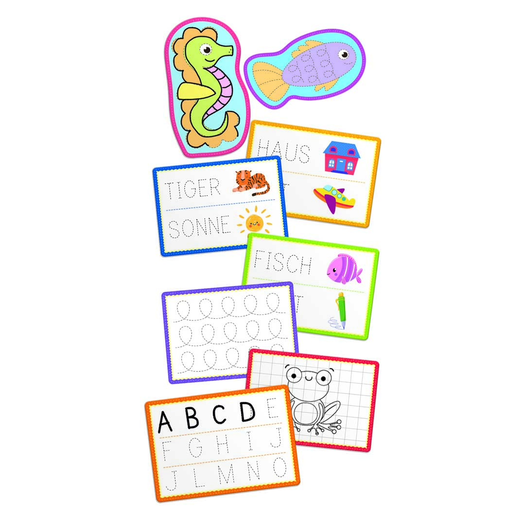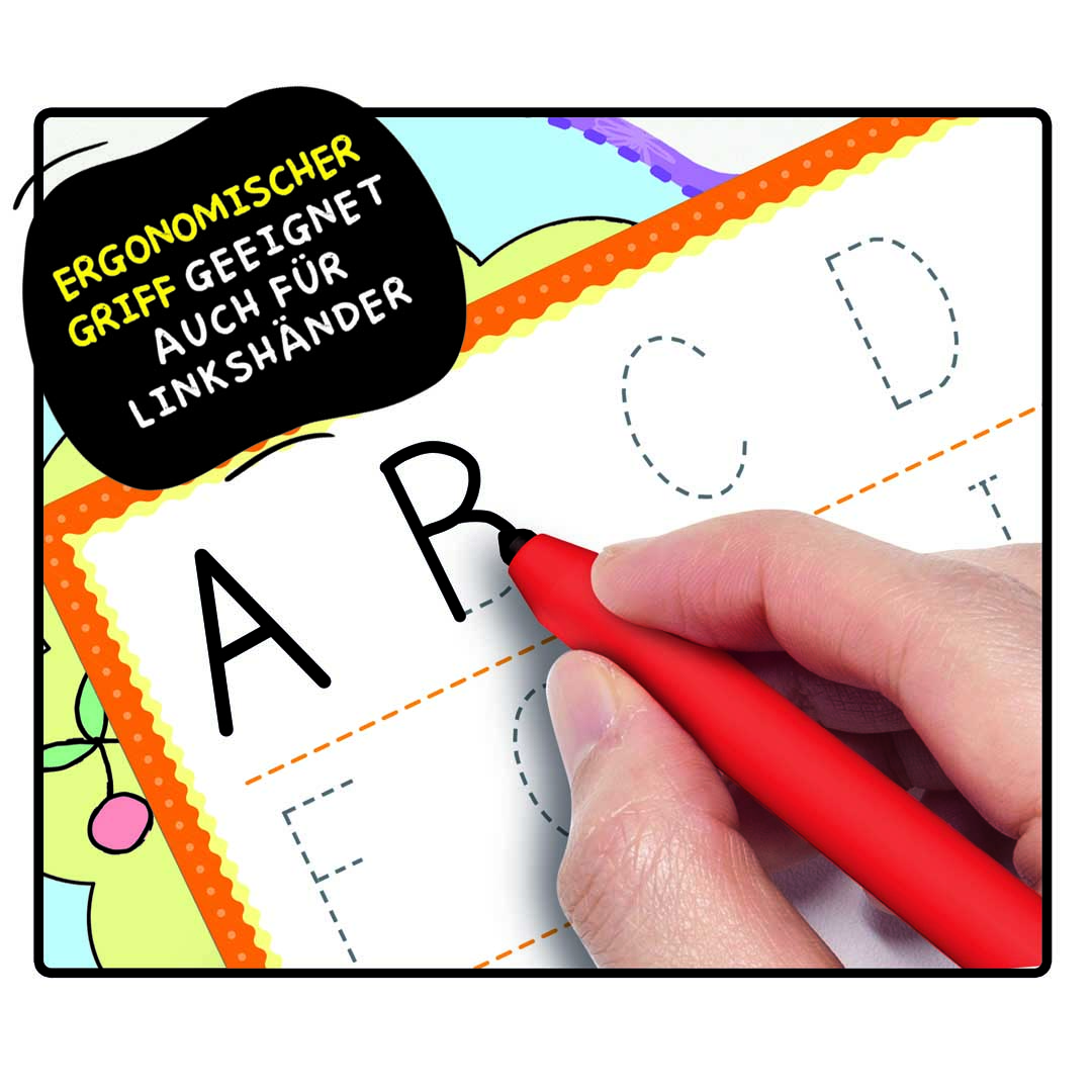 Inhalt: Ergonomischer Stift mit Deckel und Löscher, 16 doppelseitige Schreibschablonen, Anleitung.