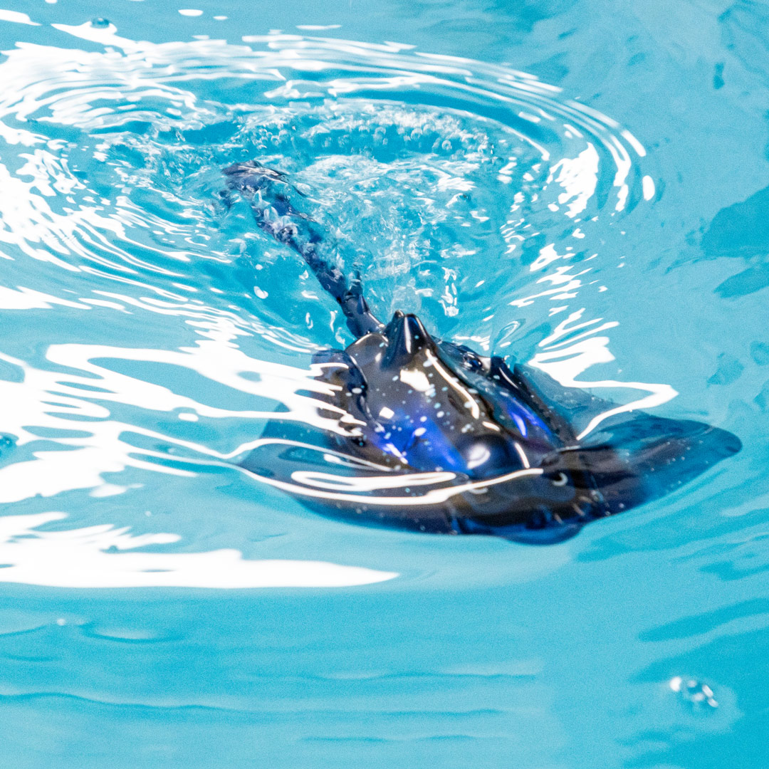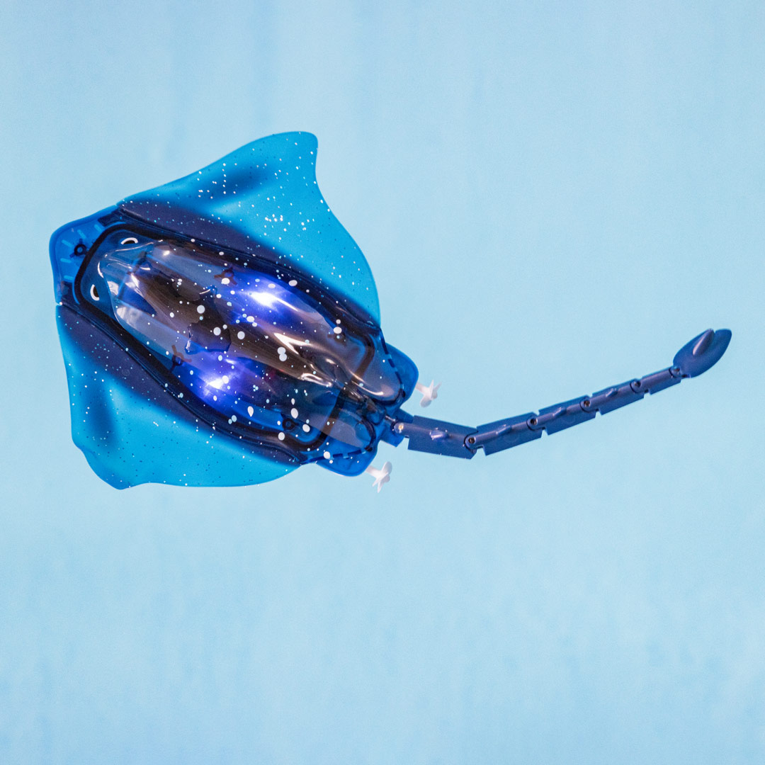 Der weiche Körper dieses ferngesteuerten Manta-Rochens beeindruckt mit beinahe lebensechten Schwimm- und Tauchbewegungen.
